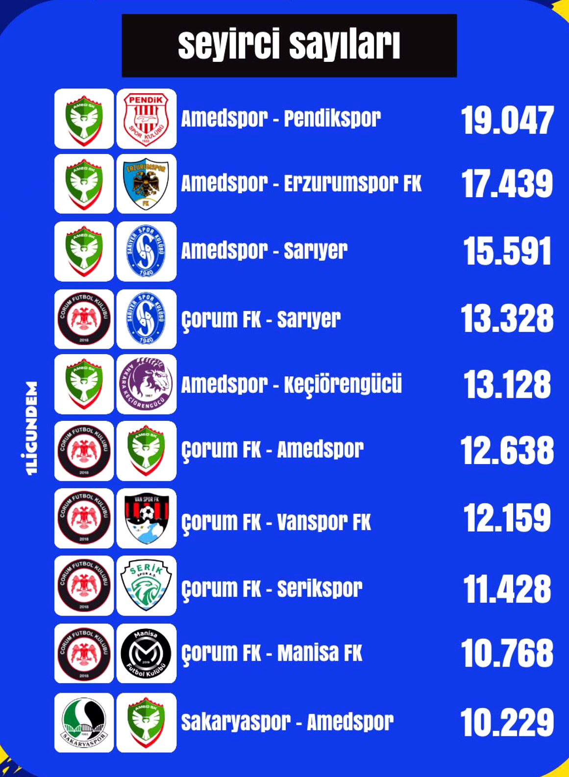 Çorum FK’nın sahasında Sarıyer ile oynadığı maç 13.328 taraftar ile dördüncü sırada yer alırken Amedspor- Keçiörengücü maçı 13.128 taraftar ile beşinci sırada yer aldı.