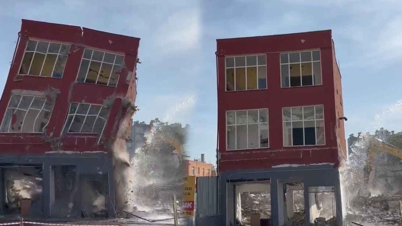 Mersin'in Tarsus ilçesinde operatör, hasar gören 2 katlı binayı kırıcıyı yere vurarak titreşimle yıktı. O anlar cep telefonu kamerasına yansıdı.
