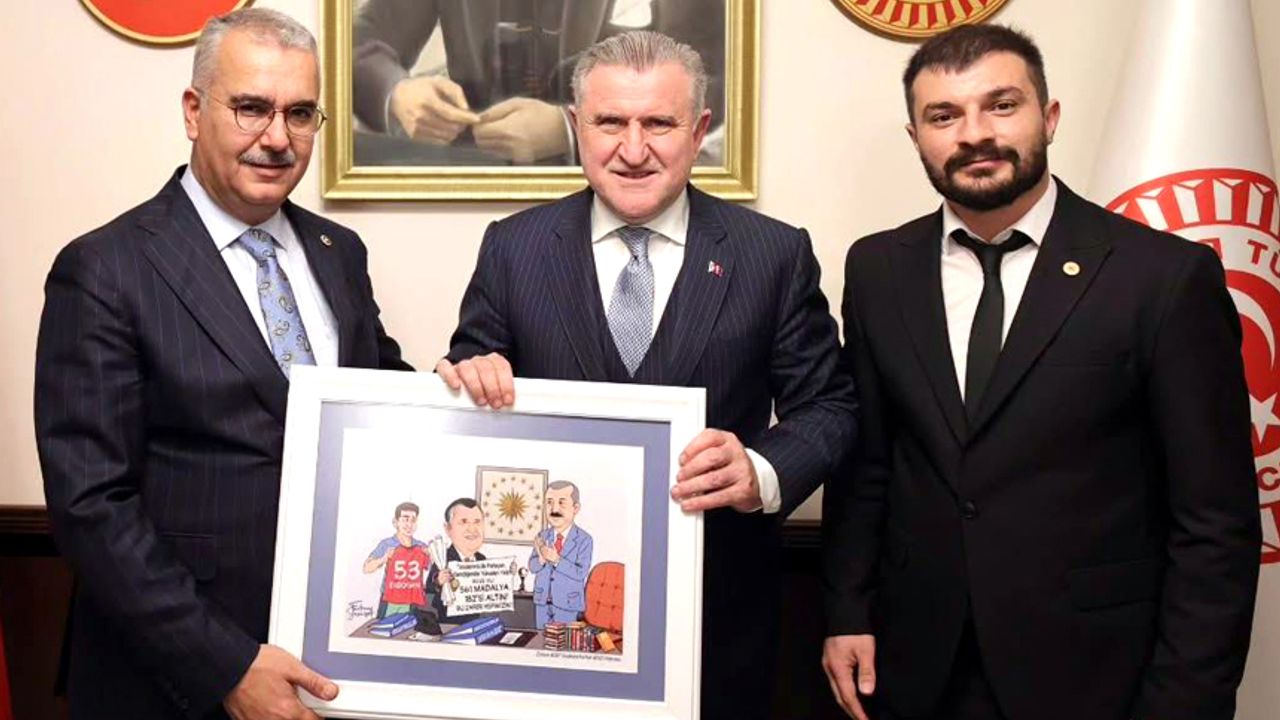 Ferhat Arıcı ziyaret sonunda Bakan Bak’a bir karikatür ve 53 numaralı Çorum FK forması hediye etti.