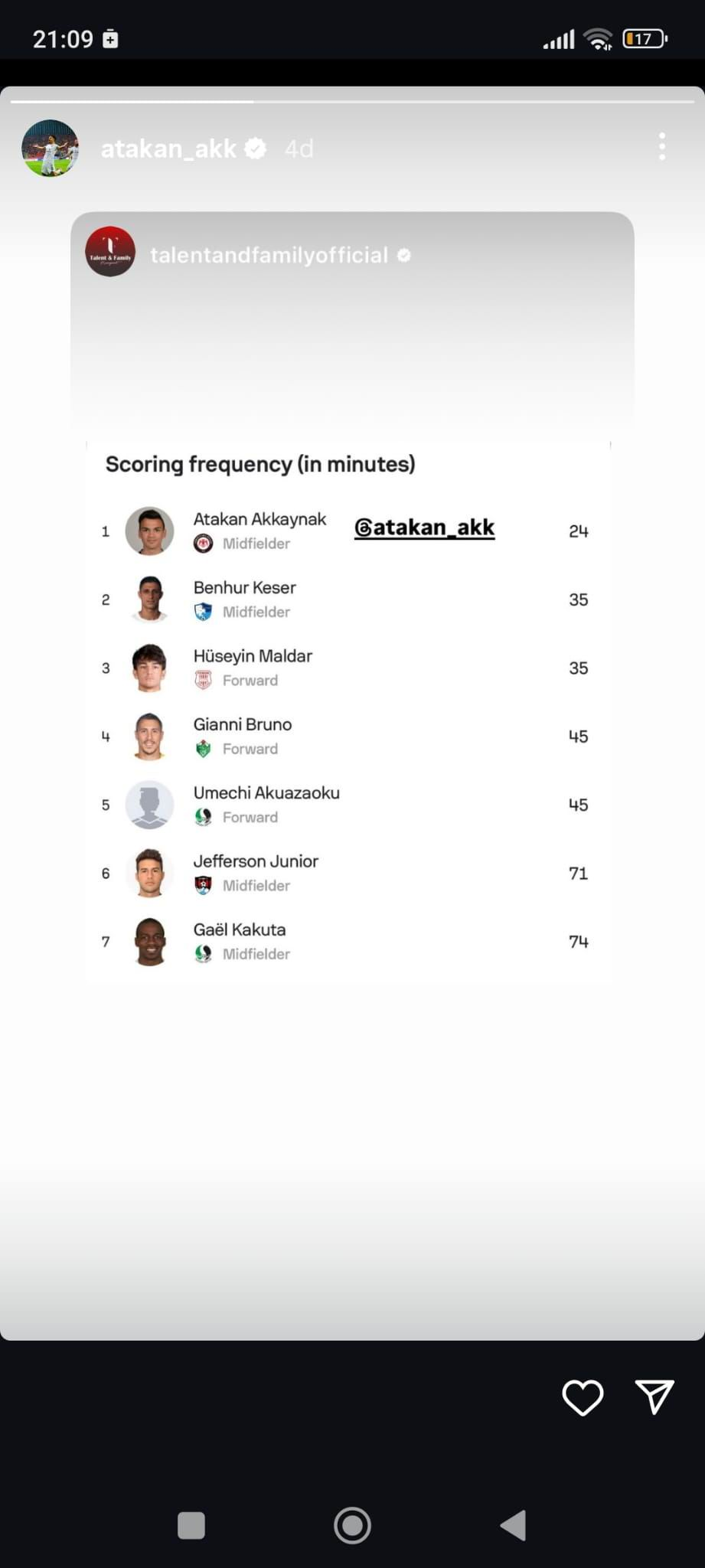 İstatiksel olarak Atakan Akkaynak aldığı süreye göre attığı iki golle 1. ligde zirvede bulunuyor. bu sıralamada Akkaynak 24 dakikada iki golle zirvede Benhur Keser 35 dakika ile ikinci Pendikspor’dan Hüsyin Maldar üçüncü Iğdır FK’dan Buruno 45 dakika ile dörrdüncü Sakaryaspor’dan Akuazaoku aynı süre ile beşinci Vanspor’dan Jeferson Junior 71 dakika ile altıncı Sakaryaspor’dan Kakuta 74 dakika ile yedinci sırada yer aldı.