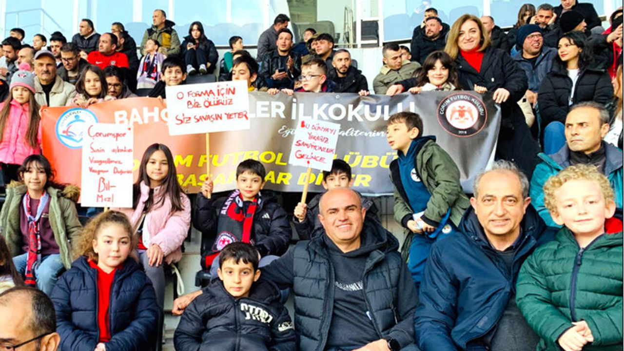 Bahçelievler İkokulu öğrencileri hazırlıdaklıra pankartlarda ‘O forma için biz ölürüz siz savaşın yeter’, Bu dünyayı yakacağız şampiyonluk gelinci’ Çorum senin aşkından vazgeçilmez, vazgeçen değerini bilemez’ sloganlarını yazdılar.