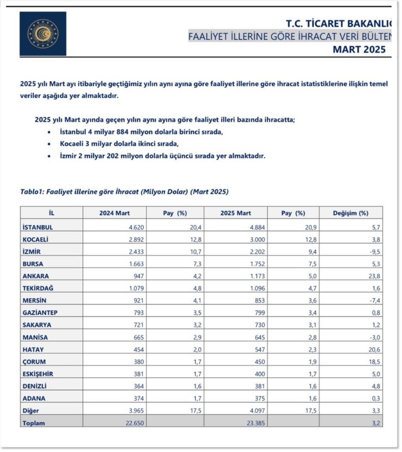 2025 yılı Mart ayında geçen yılın aynı ayına göre iller bazında ihracatta İstanbul 4 milyar 884 milyon dolarla birinci sırada, Kocaeli 3 milyar dolarla ikinci sırada, İzmir 2 milyar 202 milyon dolarla üçüncü sırada yer aldı.