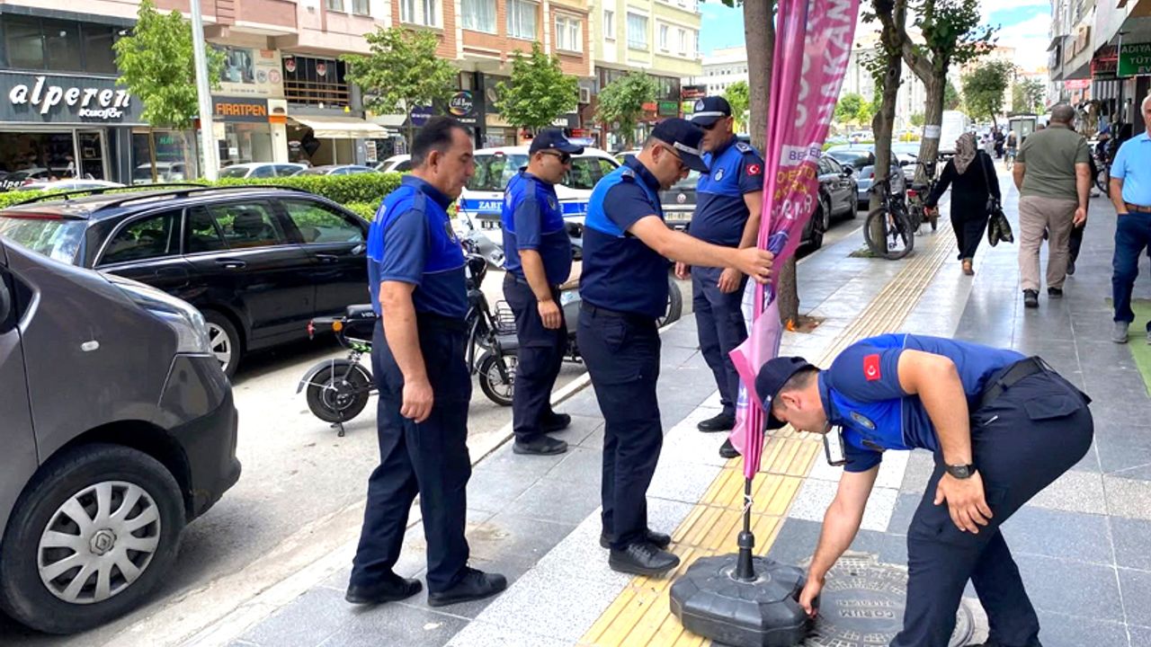 Belediye'den yapılan açıklamada, kaldırım ve yol işgaline neden olan malzemelerin zabıta ekipleri tarafından toplanacağı belirtilerek; "Esnafımız tarafından reklam amaçlı kullanılan flama, bayrak, tabela, duba vb malzemeler kaldırım işgaline neden olduğu için zabıta ekiplerimiz tarafından toplanacaktır. Kamuya ait alanların ortak kullanımı açısından tüm esnafımızın gerekli hassasiyeti göstermesini rica ederiz." denildi