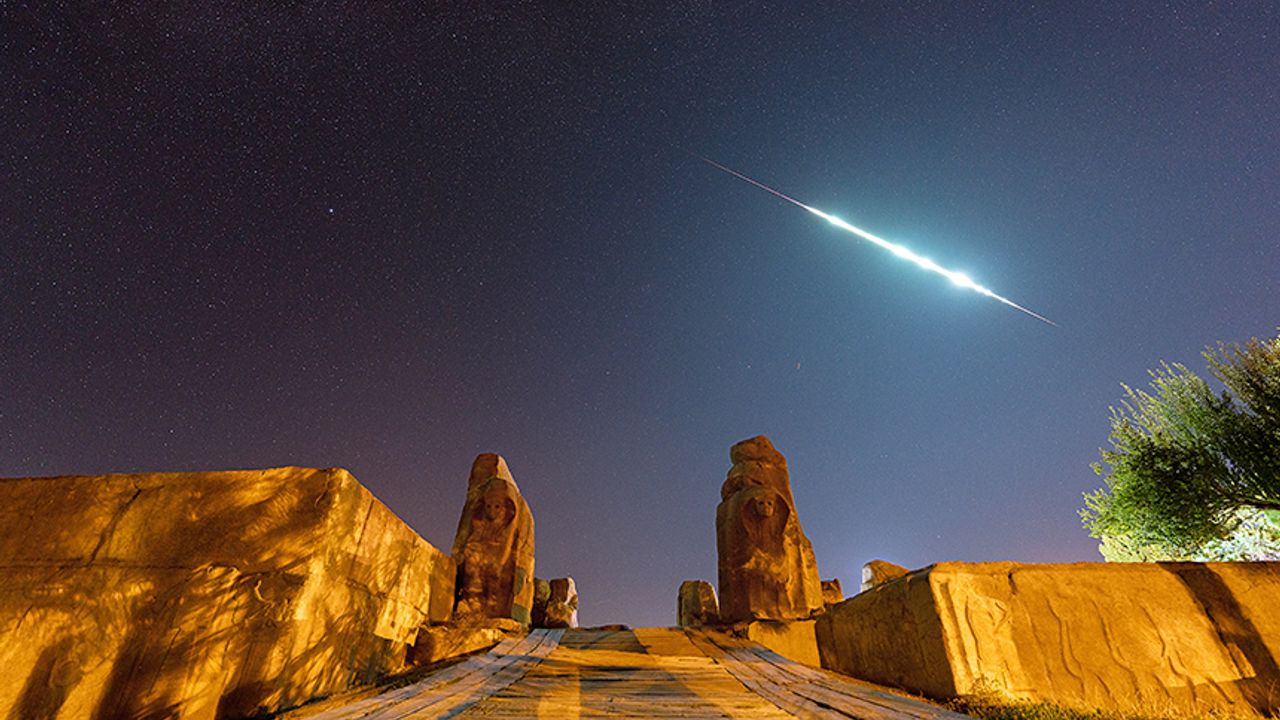Çorum’un Alacahöyük Ören Yeri’nde bulunan tarihi sfenkslerin üzerinde dün gece gökyüzünde izlenen meteor görsel şölen oluşturdu.