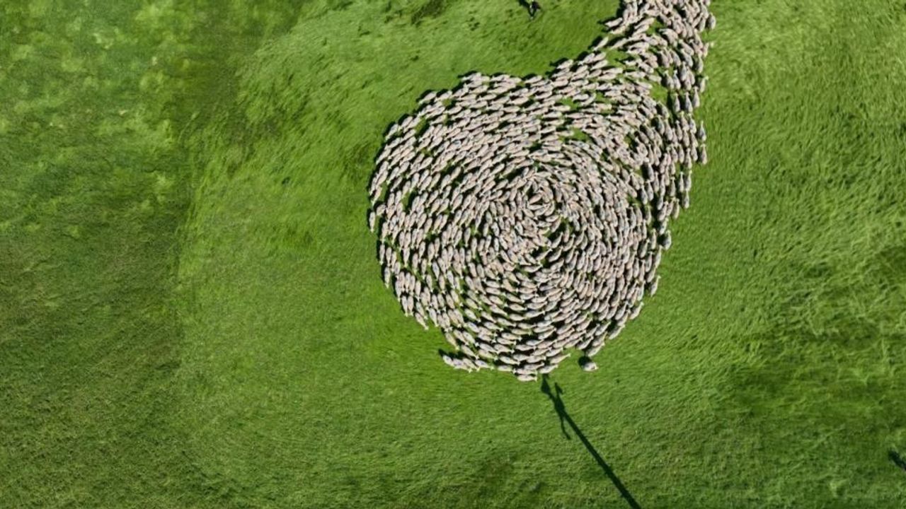 Gökyüzünden çekilen bu eşsiz görüntüler, doğayla iç içe hayvancılığın sanatsal bir anlatıma dönüştüğünü gözler önüne serdi. 20 bin küçükbaş hayvanın meralarda otlatıldığı işletmede, çobanlar tarafından yönlendirilen sürünün senkronize hareketi, izleyenleri adeta mest etti. Çobanların yönlendirmesiyle oluşan bu dairesel hareketin gökyüzünden görüntüsü, adeta bir dans gösterisini andırdı.