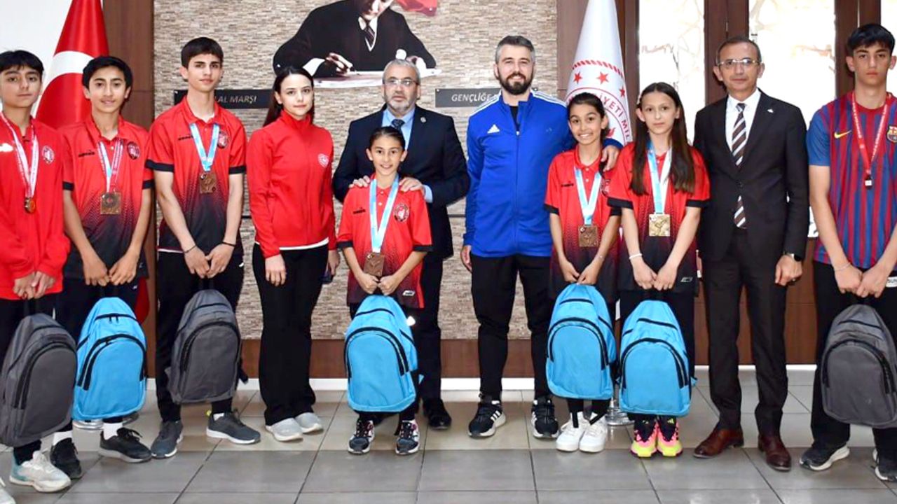 Karate İl Temsilcisi ve antrenörü Samet Türe ile birlikte Türkiye Şampiyonasında kürsüye çıkan sporcular ile binlikte Milli Eğitim Müdürü Cemil Çağlar’ı ziyaret ettiler. Ziyarete Türkiye Şampiyonu olan Adnan Menderes İlkokulu’ndan Begün Akpınar, Mehmetcik Anadolu Lisesi’nden okullarda üçüncü Türkiye Şampiyonasında altın madalya kazanan Kayra Yağlı, ile sıkletlerinde bronz madalya kazanan Başöğretmen Anadolu Lisesi’nden Kutay Tekin, Mehmetcik Anadolu Lisesi’nden Yiğit Gözübüyük, Dr. Sadık Ahmet Ortaokulu’ndan Buğra Özeker, Mehmet Akif Ersoy Ortaokulu’ndan Hatice Sena Çolak, Adnan Menderes İlkokulu’ndan Elif Gökçe Beşikci, Mustafa Kemal Ortaokulu’ndan Furkan Agurtlu, Hayrettin Karaman İmam Hatip Ortaokulu7ndan Yusuf Seha Korkmaz katıldılar.