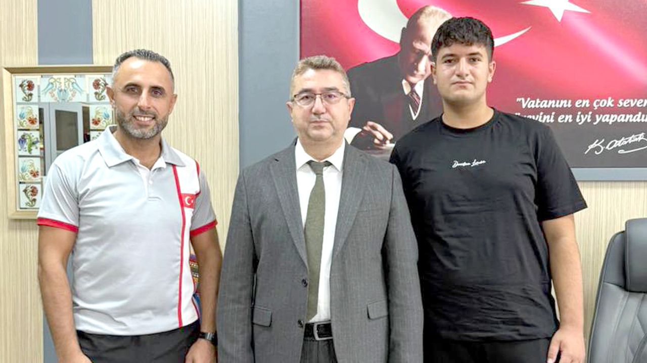 Ömer Ceylan ve Antrenörü Hakan Çıtak, Halk Eğitim Merkezi Müdürü Sadık Efe'yi ziyaret etti.