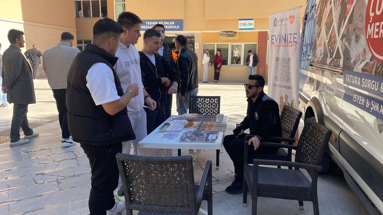Çorum Belediyesi Basın Yayın ve Halkla İlişkiler Müdürlüğü’ne bağlı Halkla İlişkiler Birimi ekipleri tarafından yürütülen çalışma kapsamında Mobil Çözüm Merkezi önünde kurulan stantta öğrencilere birebir bilgilendirme yapılıyor.