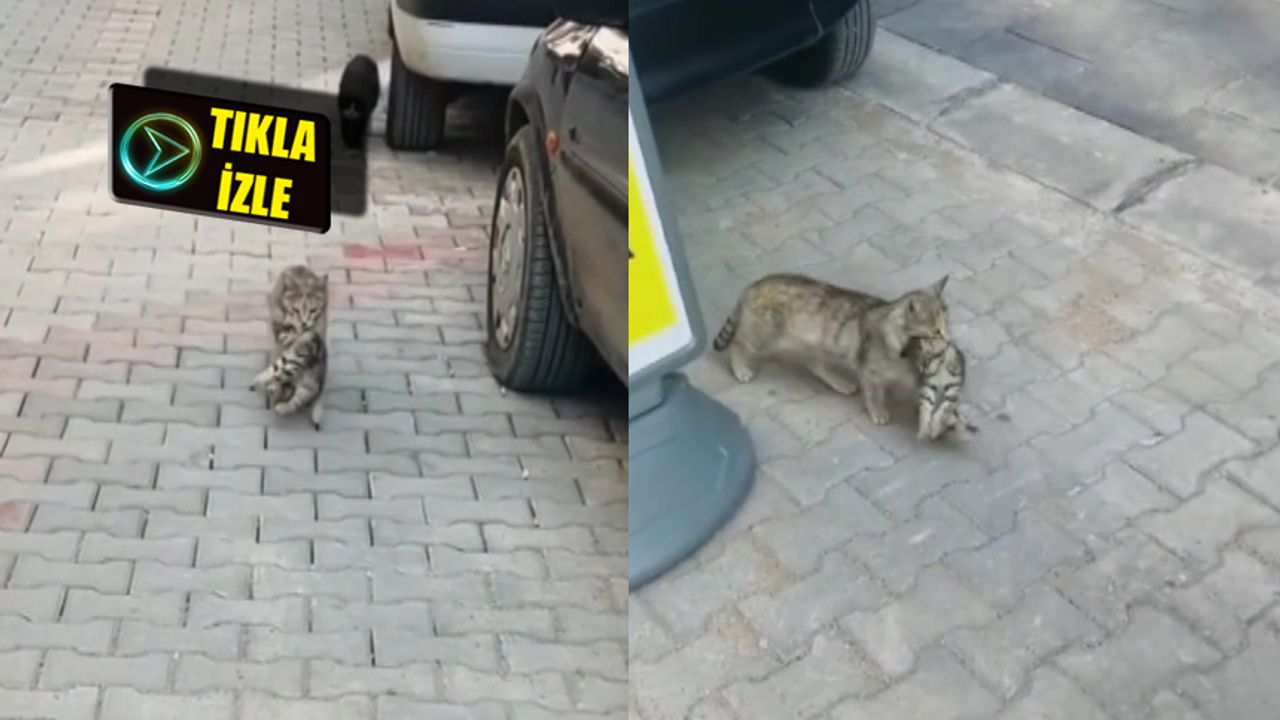 Şekerpınar Mahallesi 4003. Sokak'ta Veteriner Hekim Celal Han Şahin ve Utku Berk Kızmaz, ağzında yavrusunu taşıyan kedinin sokakta kendilerine doğru yaklaştığını fark edince cep telefonuyla görüntü aldı.