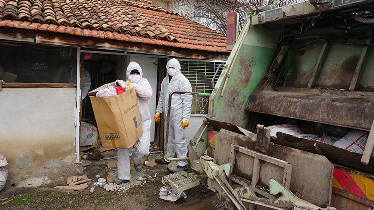 Temizlik görevlilerince başlatılan çalışmalarda evden 4 kamyon dolusu çöp çıkarıldı.