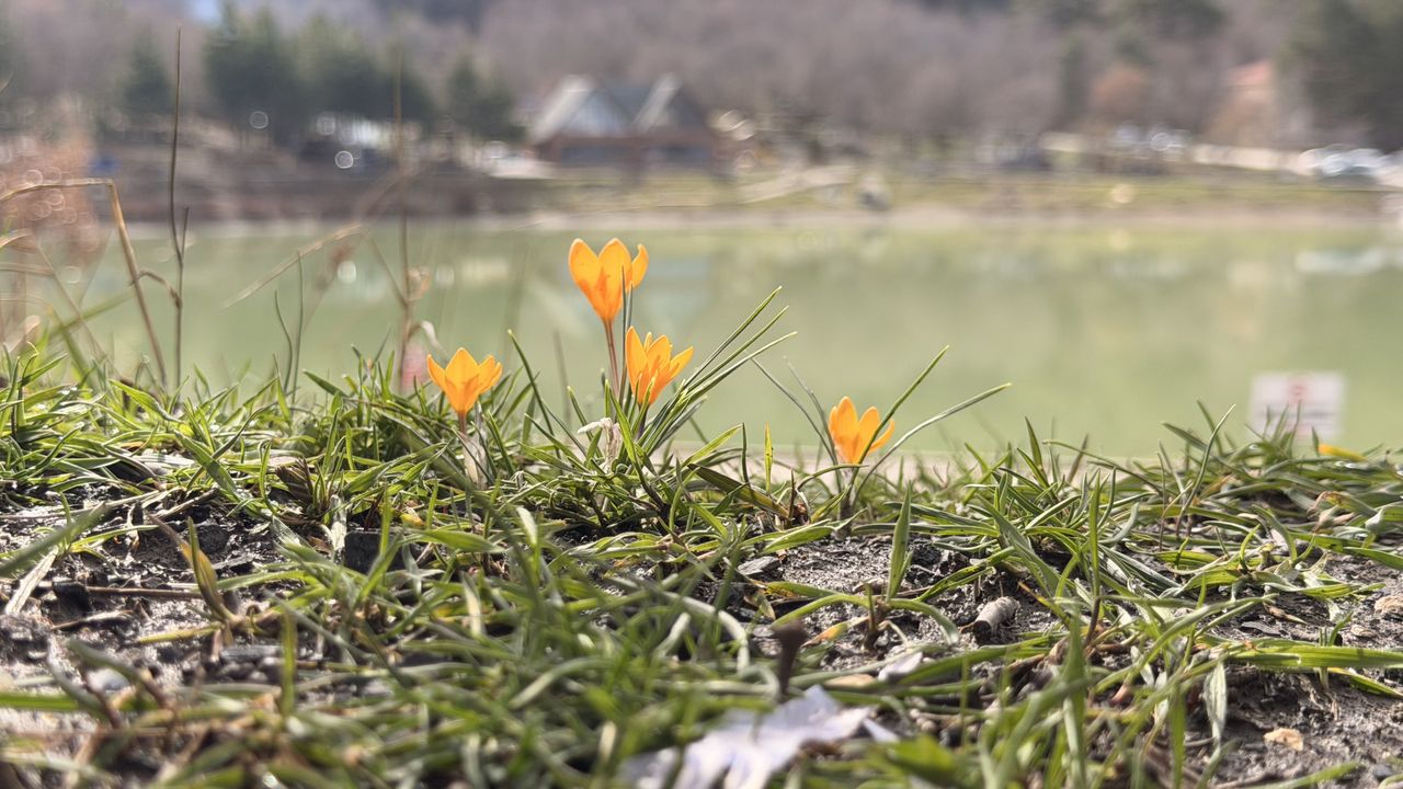Halk arasında "baharın müjdecisi" olarak bilinen sarı çiğdem ile mor menekşeler göl çevresinde güzel görüntüler oluşturdu.