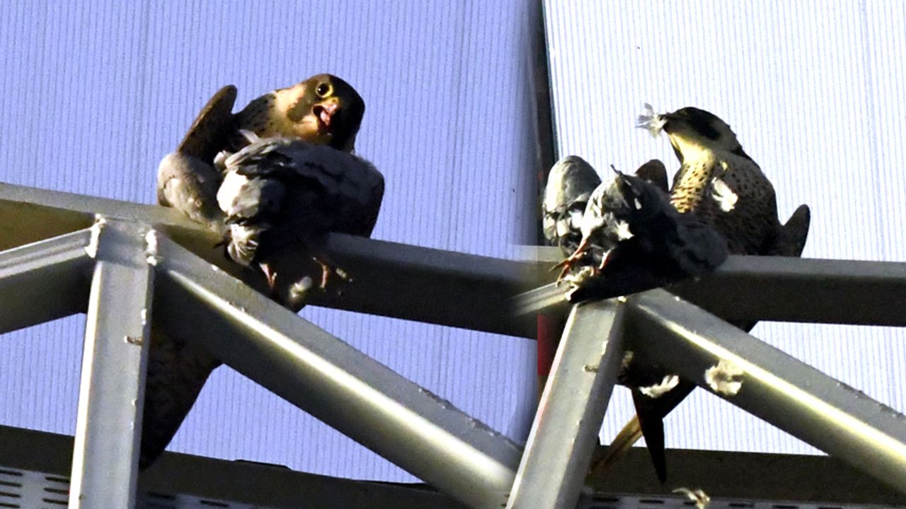 Çorum Şehir Stadyumu'nun çatısında görünen şahin, pençeleriyle kaptığı güvercini yedi.