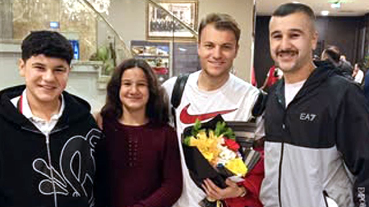 Kırmızı Siyahlı takım cuma akşam saatlerinde Bandırma’da kalacağı otele ulaştığında ilçede ikamet eden Çorumlu Yalçın ailesi çocukları ile birlikte takımı kapıda karşıladılar.