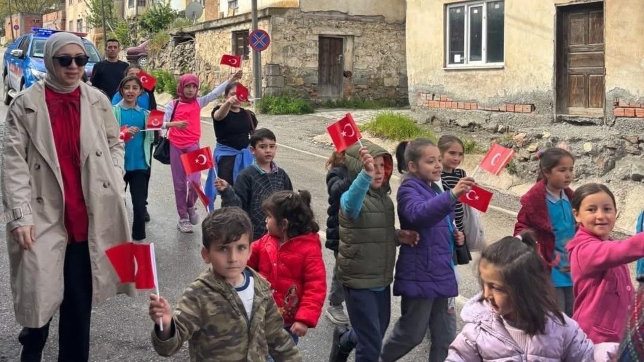 Atatürk portresi öncülüğünde, ellerinde Türk bayraklarıyla köyün sokaklarını dolaşan öğrencilere vatandaşlar da evlerinin bahçelerinden ve pencerelerinden alkışlarla eşlik etti.