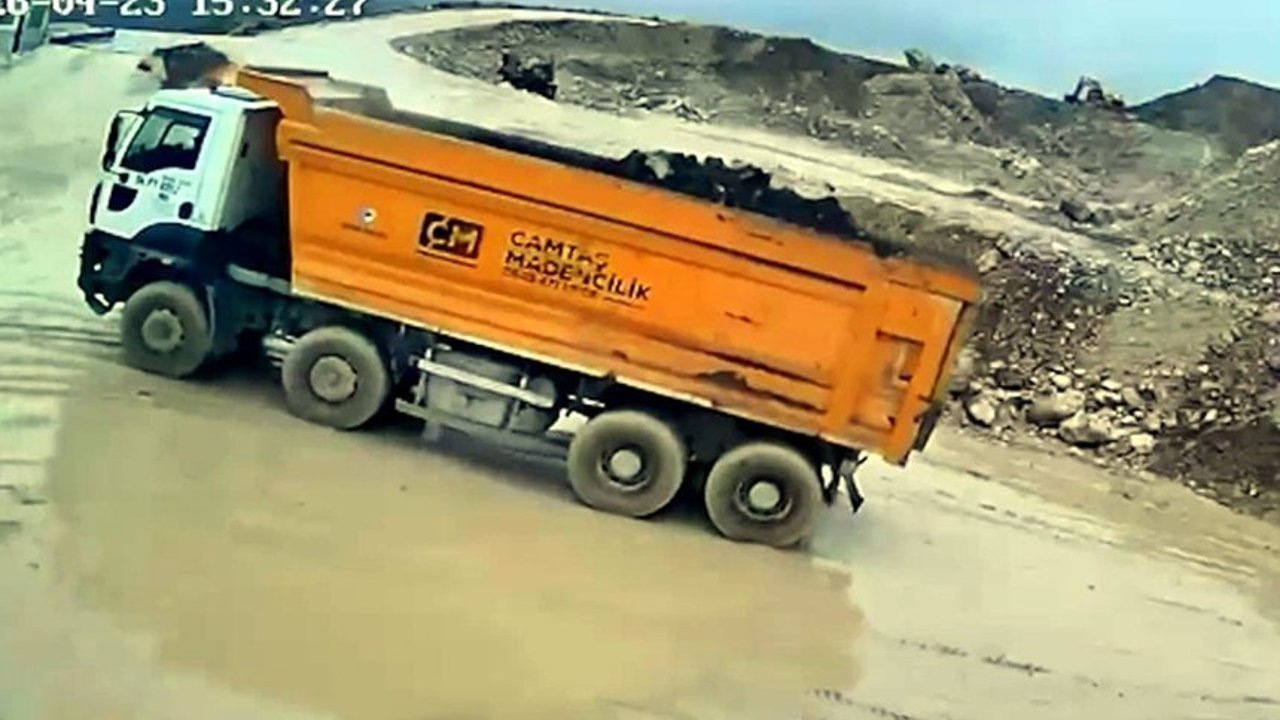 Çorum'da bir taş ocağında kamyonun devrilmesi sonucu sürücüsünün hayatını kaybettiği kaza güvenlik kamerasınca kaydedildi.