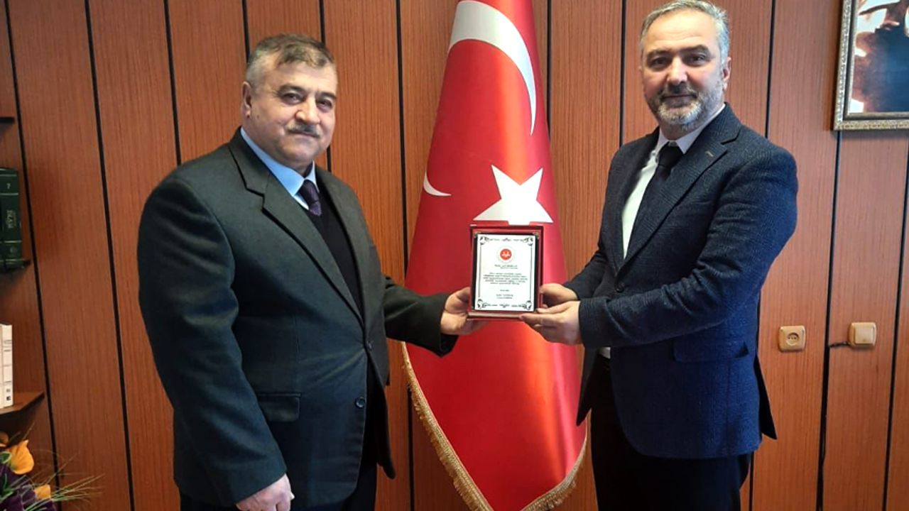 İl Müftüsü Şahin Yıldırım, emektar personelini makamında kabul ederken hayırlı olsun temennileriyle plaket takdim etti.