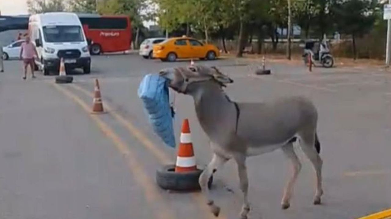 Edirne Otogarı'nda bir süredir görülen başıboş eşek, çevredeki malzemeleri ağzına alarak kaçmasıyla dikkat çekiyor. Daha önce dubayı çalıp vatandaşları peşinden koşturan eşek, bu kez sabaha karşı uyuyan otobüs şoförünün yastığını alıp uzaklaştı.
