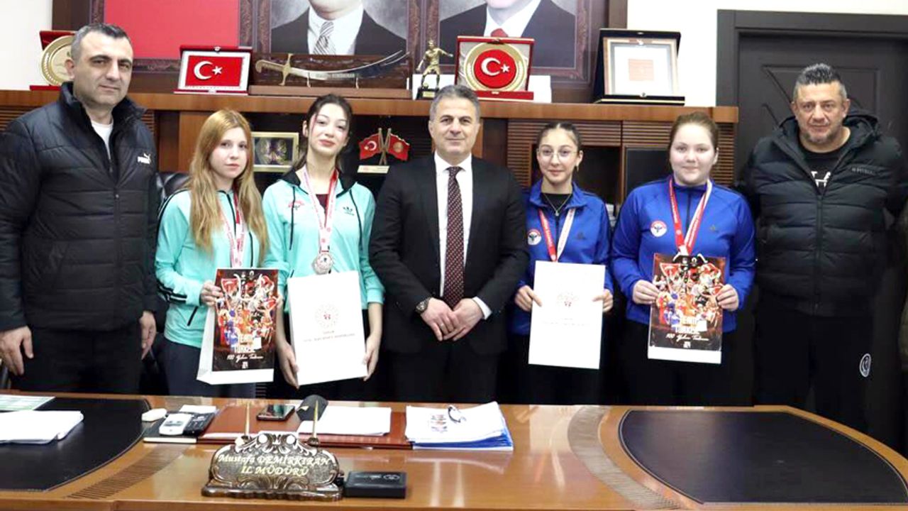 Türkiye Ju Jitsu Şampiyonasında madalya kazanan Deren Balım Çilingir, Denis Duru Çalışkan, Buse Selçuk ve Kübra Çatar ile antrenörlerinin ziyareti sırasında madalyalarını İl Müdürü Mustafa Demirkıran ile paylaşan sporcular kazandıkları tecrübe ve deneyimler hakkında bilgi verdiler.