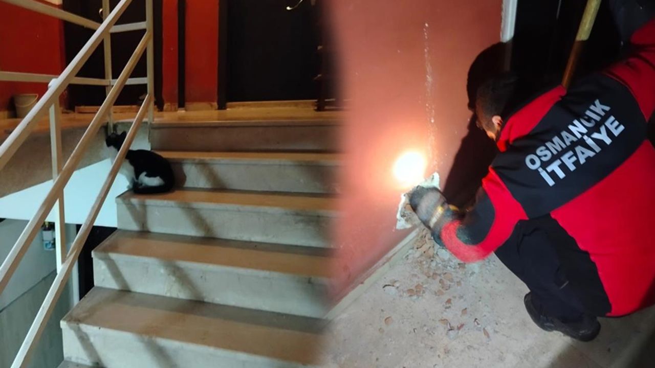 İhbar üzerine, olay yerine Osmancık Belediyesi itfaiye ekipleri sevk edildi. Ekipler, duvarı delerek kediyi bulunduğu yerden aldı.