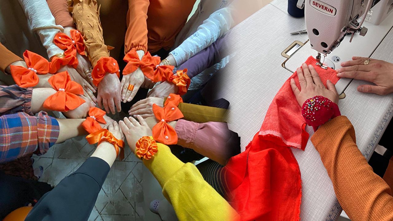 Etkinlikte Aile Destek Merkezi (ADEM) kursiyerleri ile kadın katılımcılar, kadına yönelik şiddetle mücadelede uluslararası sembol olarak kullanılan turuncu temalı toka ve bileklikler hazırladı.