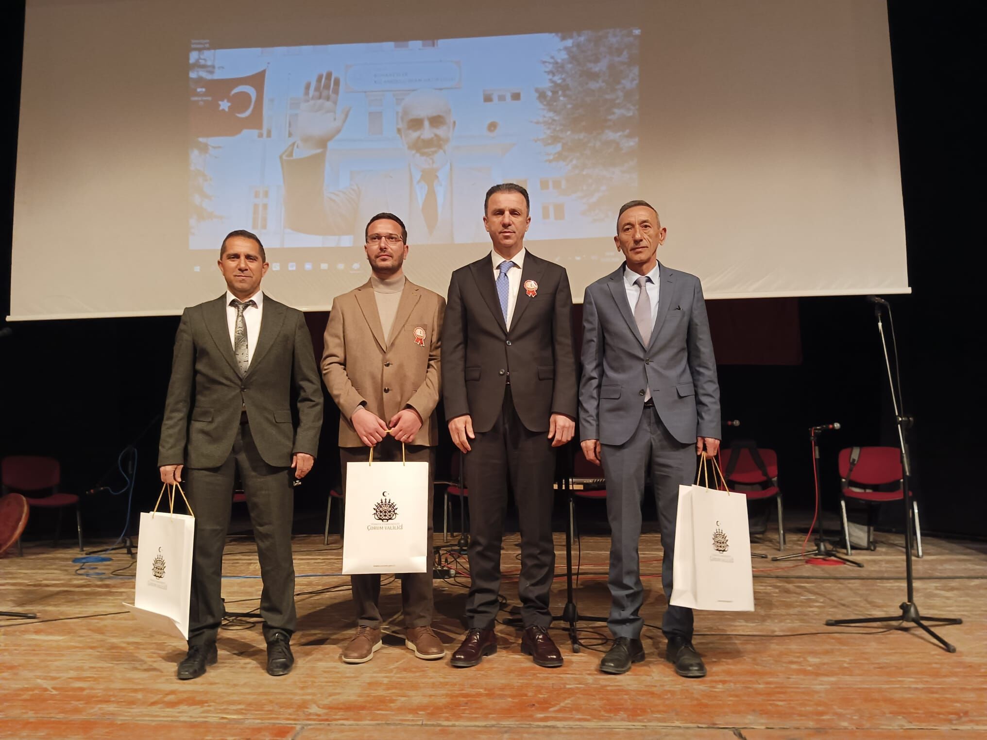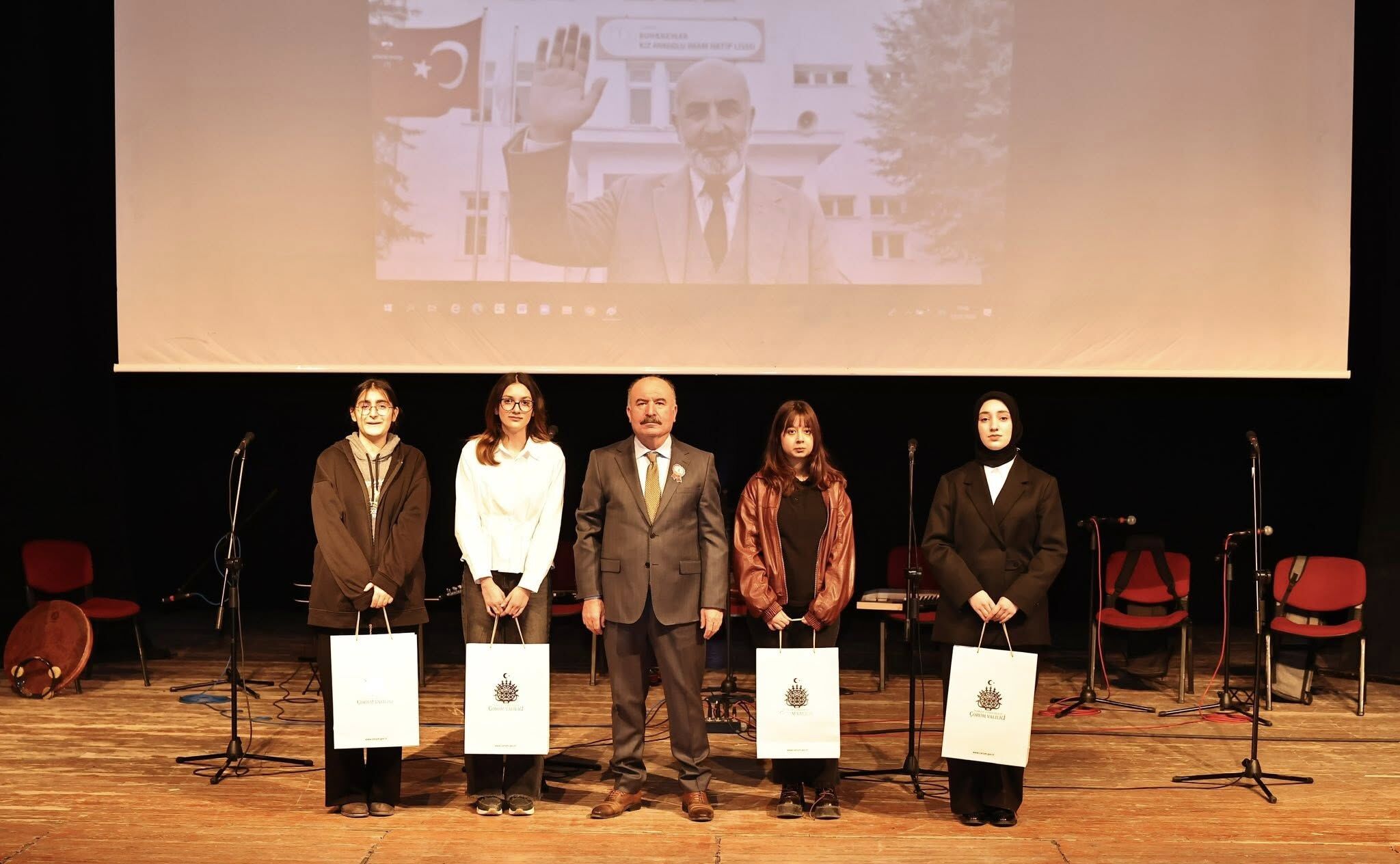 Konuşmaların ardından ortaokullar arası 12 Mart İstiklal Marşı’nın Kabulü ve Mehmet Akif Ersoy’u Anma Bilgi yarışmasında dereceye giren Şehit Osman Arslan Anadolu Lisesi öğrencileri Aslı Sena Ünlü, Esilanur Kabakcı, Şevval Sağbazar ve Evsanur Kaplan’a ödülünü Vali Ali Çalgan takdim etti.