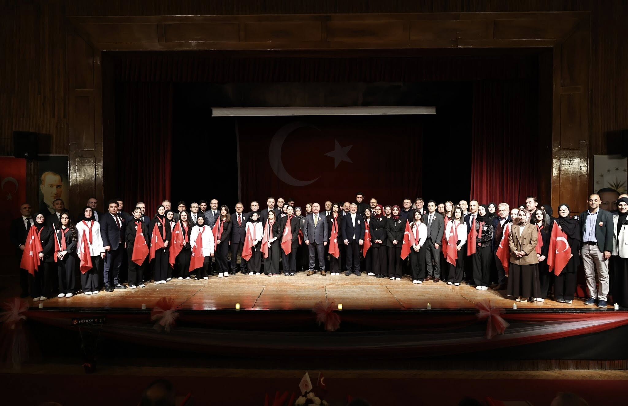 “1921 yılında kabul edilen İstiklal Marşı, yalnızca bir şiir değil, bir milletin inancının, imanla yoğrulmuş azminin birlik ve beraberlik şuuruna ve özgürlük tutkusunun haykırışıdır. Bu eşsiz eserle Mehmet Akif Ersoy, milletimizin en zor zamanlarında kalemiyle umut olmuş, yüreklere cesaret aşılamıştır. O, İstiklal Marşı'nı yazarken, milletimizin imanını, vatan sevgisini ve bağımsızlığı kararlarını dizelere dökmüştür. ‘Korkma’ diye başlayan bu marş, umutsuzluğun değil direnişin, esaretin değil, istiklalin ve bir milletin yeniden ayağa kalkışının ifadesidir. İstiklal Marşı'nı okurken sadece sözlerini değil, taşıdığı ruhu da anlamalıyız. Çünkü bu marş bizlere vatanın ne büyük fedakarlıklarla kazanıldığını hatırlatır. Bizlere düşen görev ise atalarımızın emanetine sahip çıkmak, çok çalışmak ve ülkemizi her alanda ileriye taşımaktır.” dedi