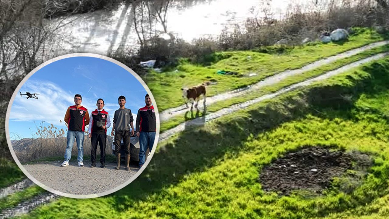 Dron destekli arama çalışmasında yeri belirlenen buzağı, işletmeden yaklaşık 3 kilometre uzaklıkta çeltik tarlasında bulundu.