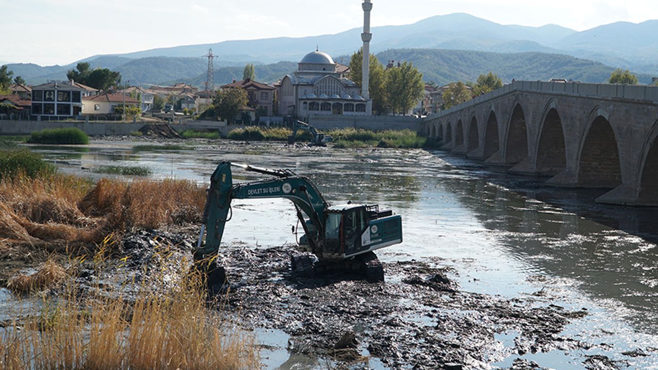 Devlet Su İşleri (DSİ) 5. Bölge Müdürlüğü ekipleri nehirdeki sazlık alanlar ve nehir dibindeki balçığı temizliyor.