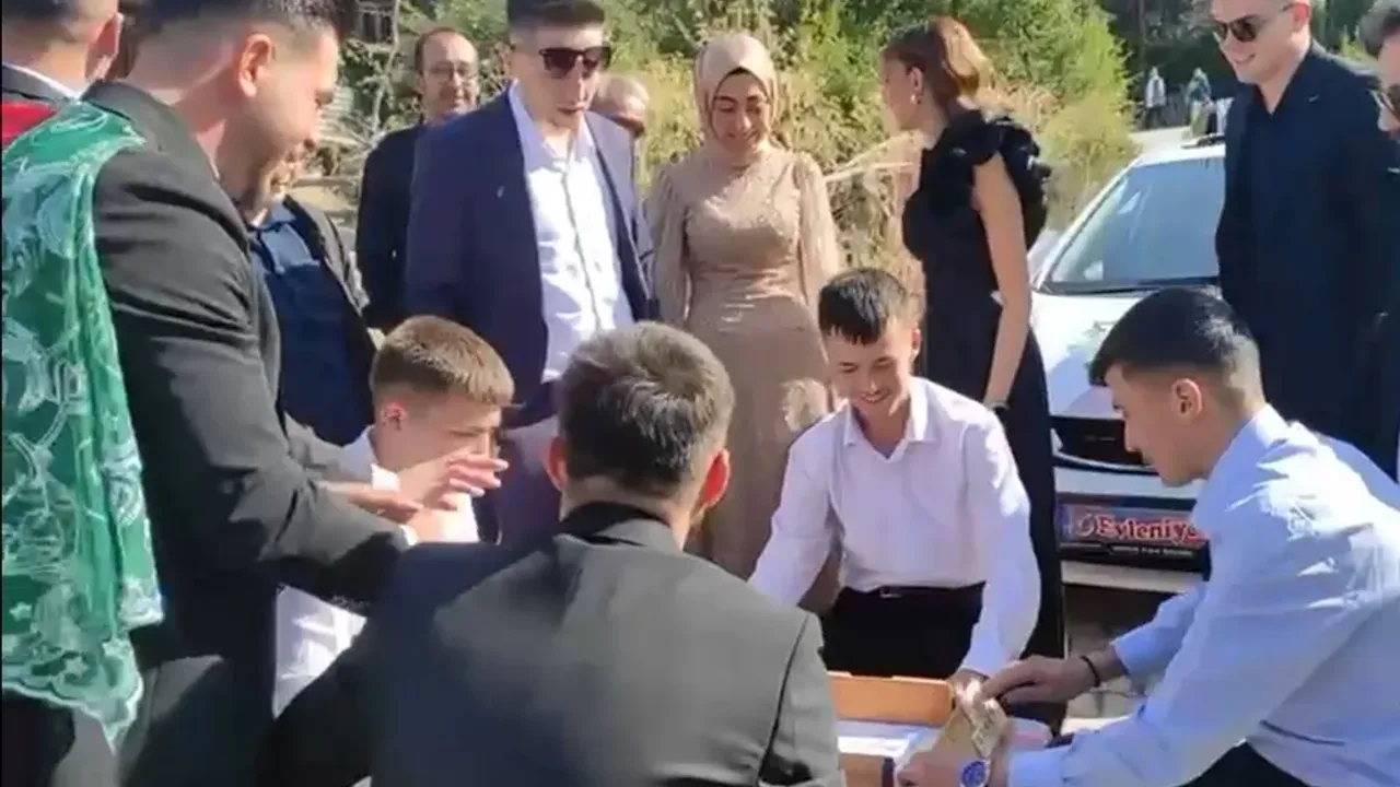 Bir süre sohbet eden damat ve yanındakiler, yolu kesenlere bir miktar para verdi. Bahşişi alan arkadaşları, okey masasını hızla yoldan kaldırarak konvoyun geçişine izin verdi. Gelin ve damat köye doğru hareket ederken, o anlar ise cep telefonu kamerasına kaydedilip sosyal medyada paylaşıldı