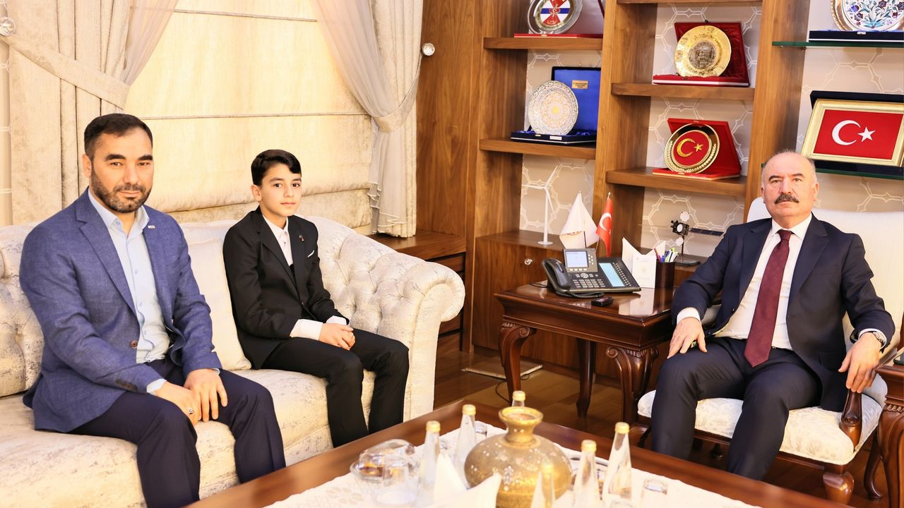 Hafızlığını tamamlayan Hafız İhsan Emre Sezer, babası Turan Sezer ile birlikte Vali Ali Çalgan'a nezaket ziyaretinde bulundu.