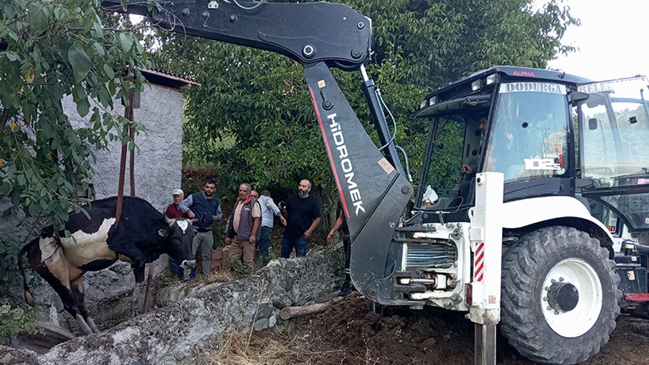 İhbar üzerine gelen ekipler, halat bağladıkları ineği kepçe yardımı ile kuyudan çıkardı.