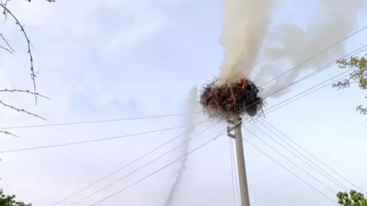 Çorum'un Dodurga ilçesindeki bir elektrik direğinde çıkan yangında leylek yuvası kullanılamaz hale geldi.