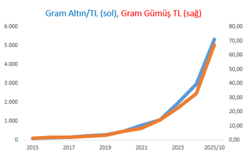 Altın ve gümüş fiyatları dolarla belirlendiği için bu durum Türk yatırımcısı açısından ikili bir kazanca kapı aralıyor: (1) Altın ve gümüş fiyatları güvenli liman yaklaşımıyla arttığı için kazanç sağlanıyor. (2) Türk Lirası dolara karşı değer kaybettiği için oradan da kazanç sağlanıyor. Dolar düşer altın artarsa ya da altın düşer dolar artarsa kazanç var. İkisi birden artarsa doğal olarak daha fazla kazanç söz konusu oluyor. Ancak hem dolar kuru hem de altın ve gümüş fiyatları düşerse kayıp söz konusu olur ki bu da çok sık görülen bir durum değil."