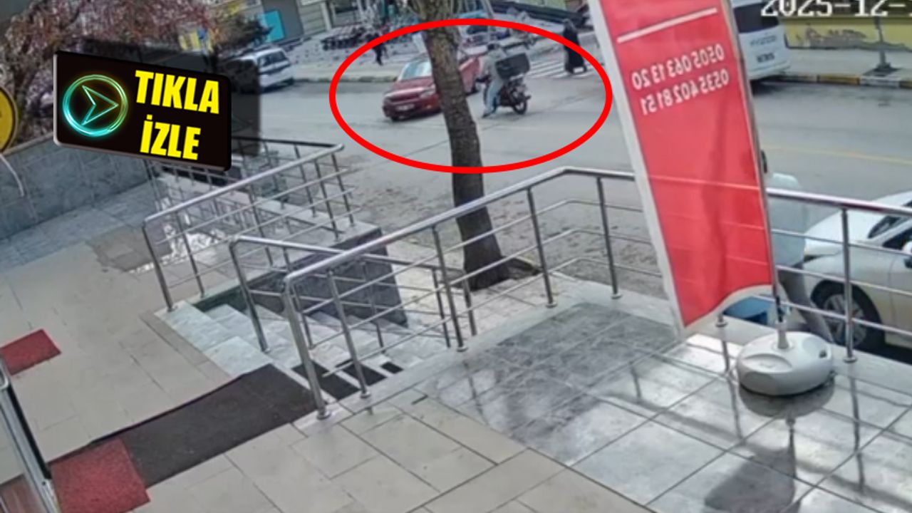 Çarpışmanın etkisiyle yere düşen kurye, hafif şekilde yaralanırken, kaza anı çevredeki bir iş yerinin güvenlik kamerasına yansıdı.