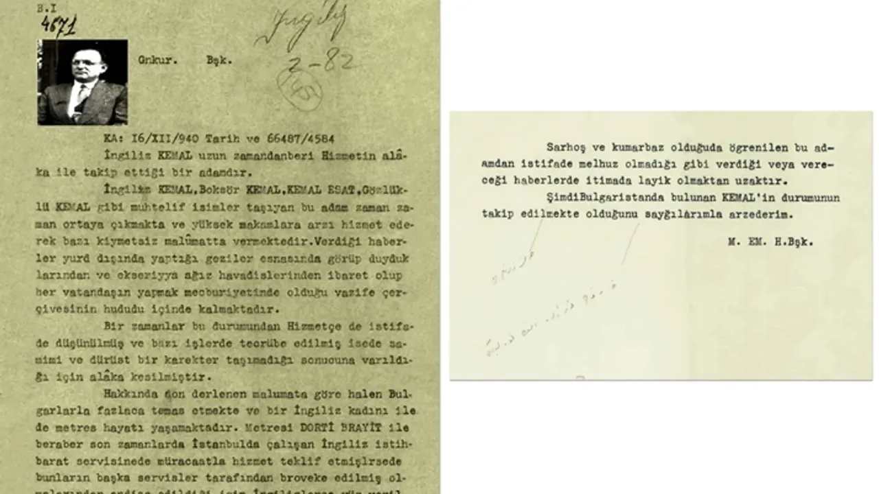 Hakkında dün derlenen malumata göre, halen Bulgarlarla fazlaca temas etmekte ve bir İngiliz kadını ile de metres hayatı yaşamaktadır. Metresi Dorti Brayit ile beraber son zamanlarda İstanbul'da çalışan İngiliz İstihbarat Servisi'ne de müracaatla hizmet teklif etmişlerse de bunların başka servisler tarafından provoke edilmiş olmalarından endişe edildiği için İngilizlerce yüz verilmemiş ve bunun üzerine Alman istihbaratı ile temasa geçmek üzere çalıştıkları duyulmuştur. Sarhoş ve kumarbaz olduğu da öğrenilen bu adamdan istifade melhuz olmadığı gibi verdiği veya vereceği haberler de itimada layık olmaktan uzaktır. Şimdi Bulgaristan'da bulunan Kemal'in durumunun takip edilmekte olduğunu saygılarımla arz ederim."