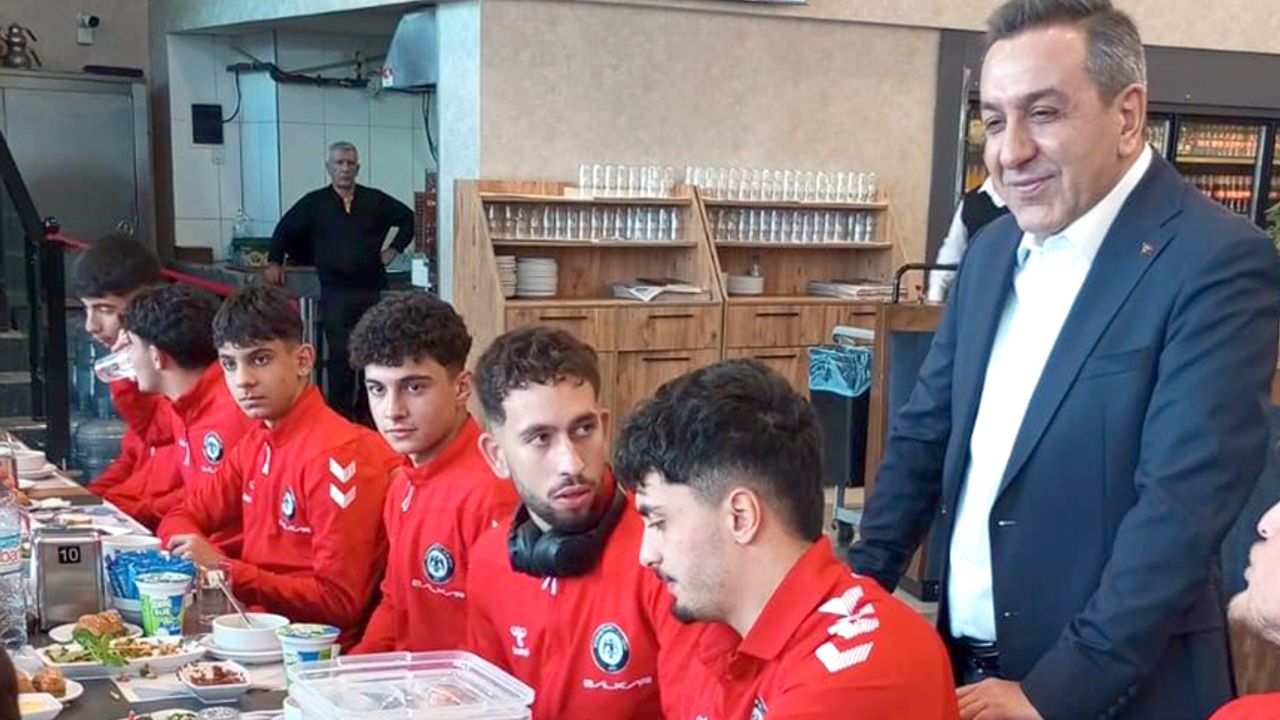 Yoldan dönerek tesislerde yemek yiyen Çorum FK U 19 takımı Teknik Sorumlusu Yasin Aksoy ve futbolcularla sohbet eden Muhsin Dere çalışmalar hakkında bilgiler aldı ve kendilerine başarılar diledi.