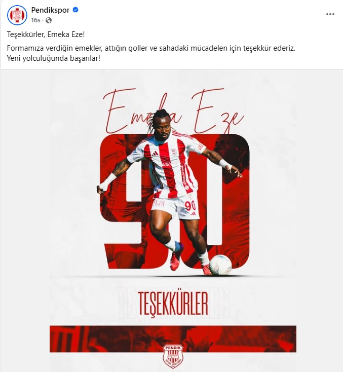 Pendikspor sosyal medya hesabından Emeka Eze'ye teşekkür ederken, Eze'nin önümüzdeki günlerde Bolu'daki kampa katılması bekleniyor.