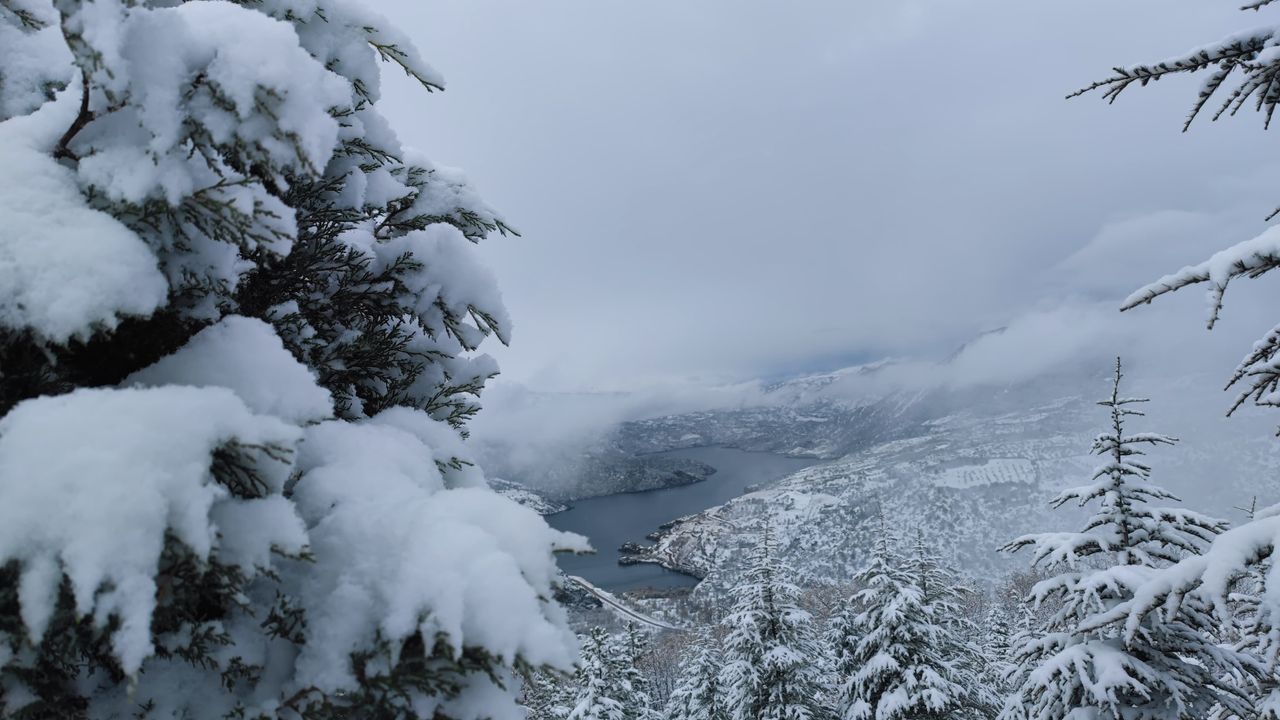 Çorum'un Oğuzlar ilçesindeki Obruk Barajı Gölü ve çevresini kaplayan ormanlık alan karla kaplandı.