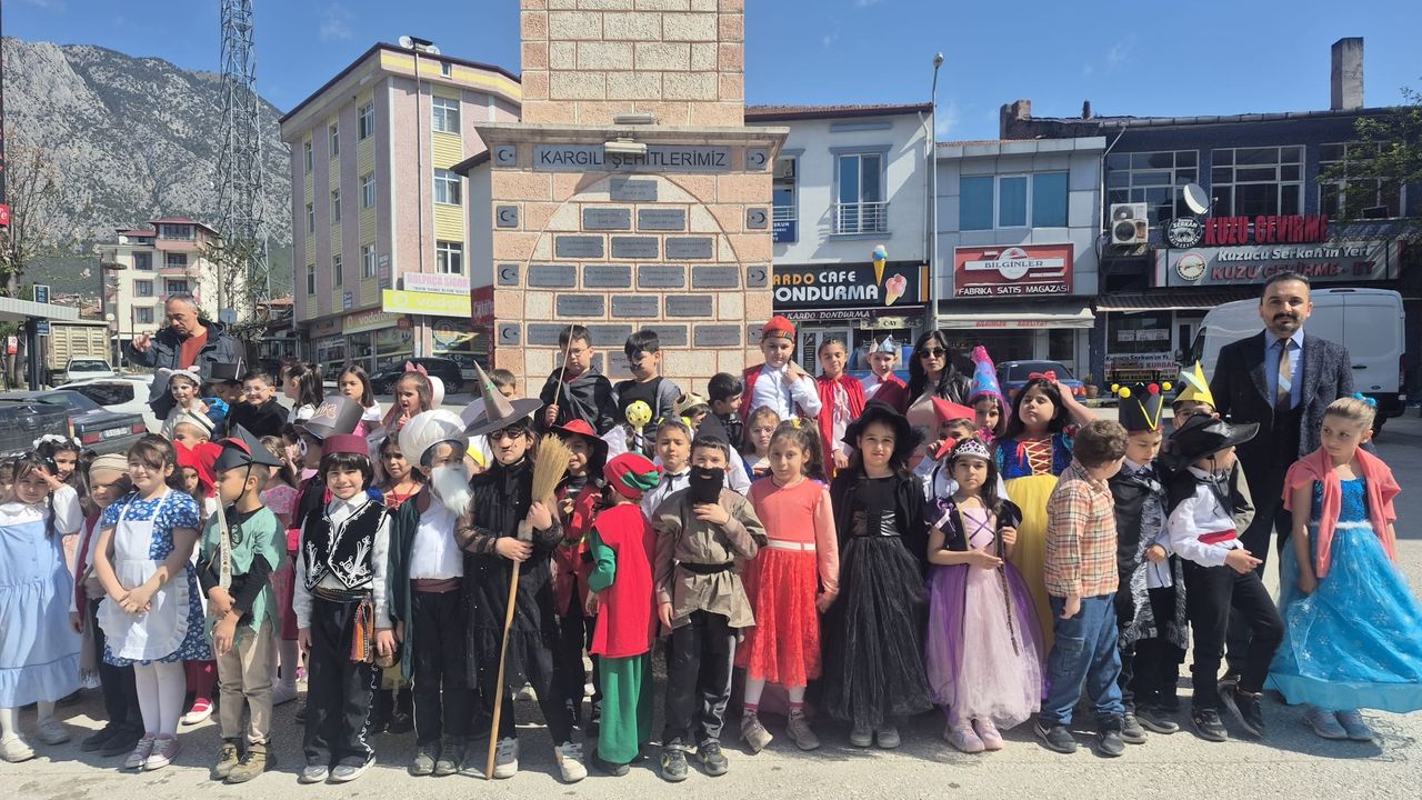 Çorum'un Kargı ilçesinde ilkokul öğrencileri, sevdikleri hikaye kahramanlarının kostümlerini giyerek kitap okuma farkındalığı oluşturdu.