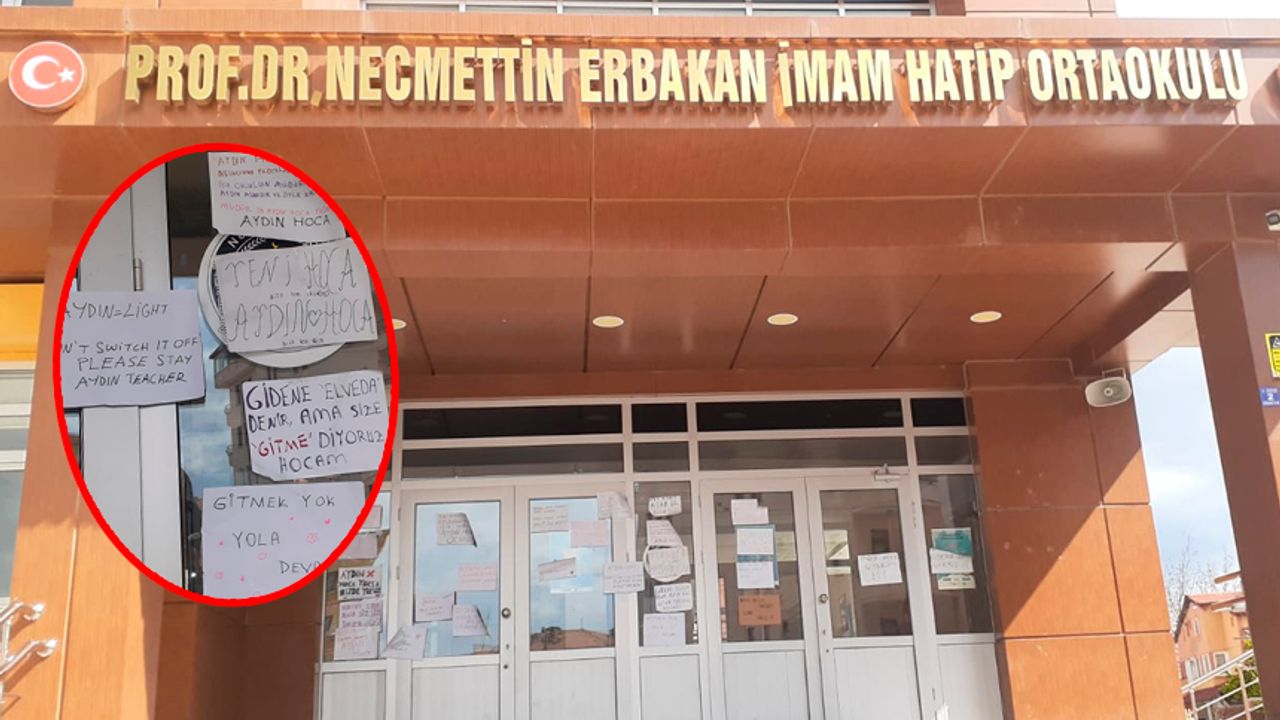 Prof. Dr. Necmettin Erbakan İmam Hatip Ortaokulu öğrencileri, okul müdürü Aydın Asar'ın başka okula tayin olmasına yönelik üzüntülerini okulun giriş kapısına astıkları afiş ve resimlerle dile getirdiler.