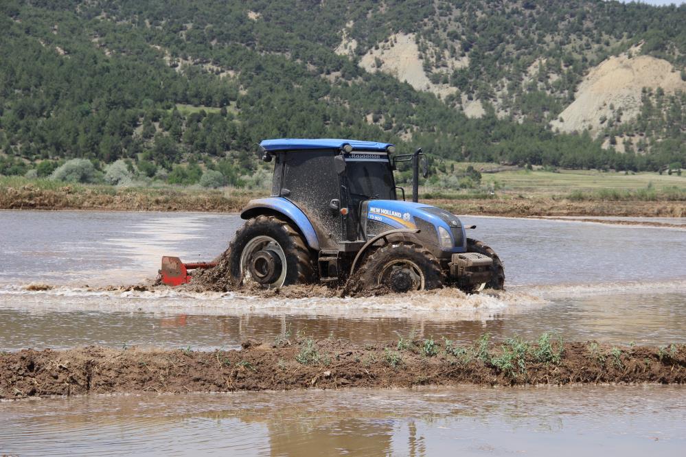 Çorum'un Osmancık ilçesinde çiftçiler, 24 bin dekar alanda çeltik ekimi için zorlu mesaisini sürdürüyor.