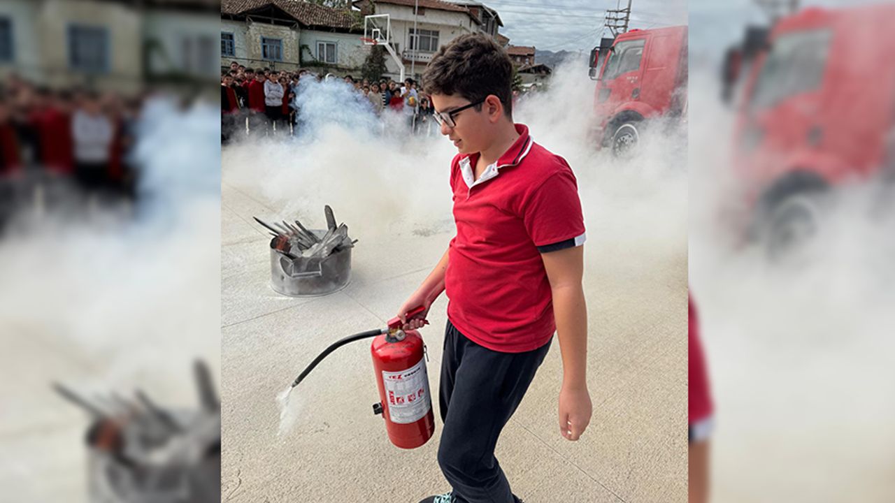 Öğrenciler, yangın söndürme cihazlarının kullanımıyla ilgili uygulamalı tatbikata katılarak temel güvenlik bilgilerini deneyimleme fırsatı buldu.