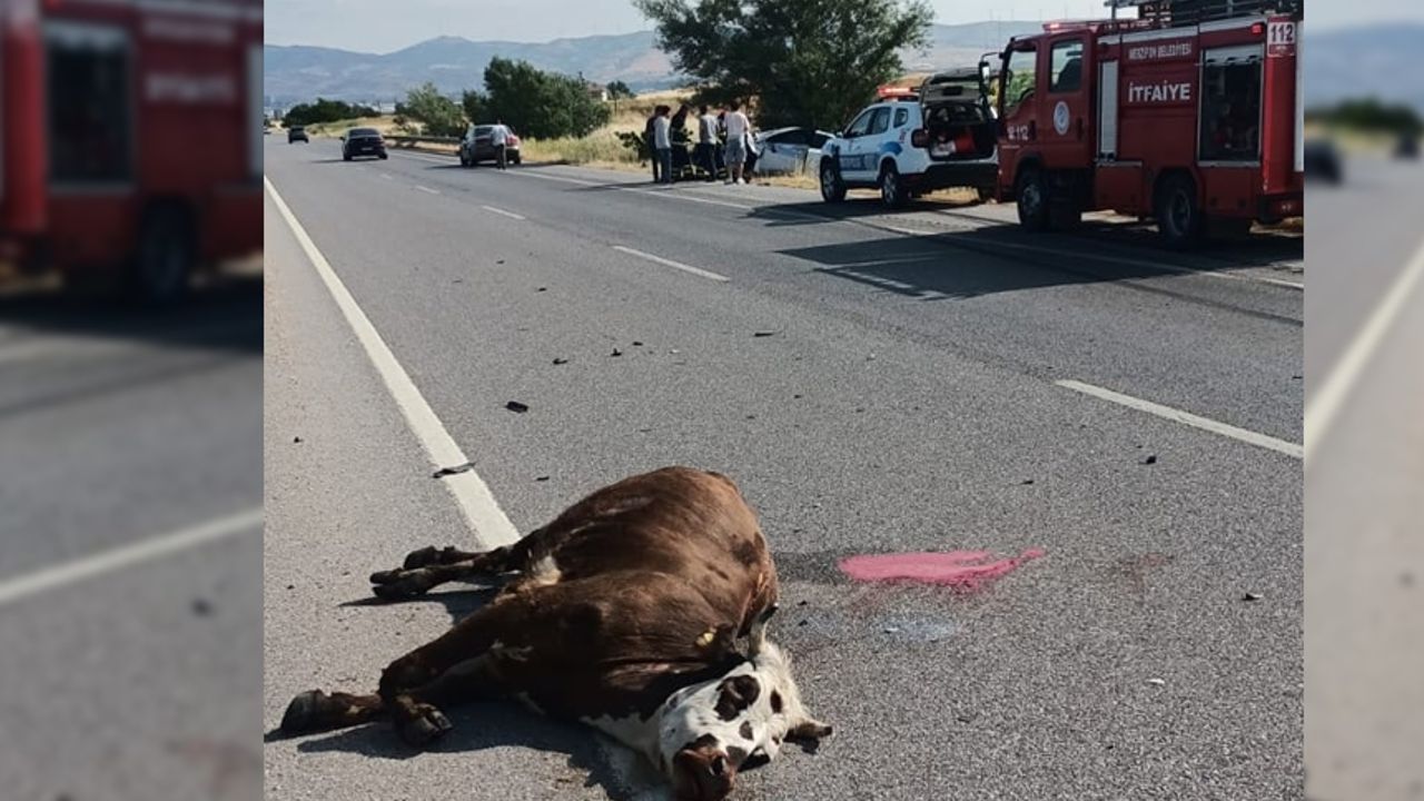 İnek olay yerinde telef olurken hasar gören otomobildeki kazadan şans eseri kurtuldu.