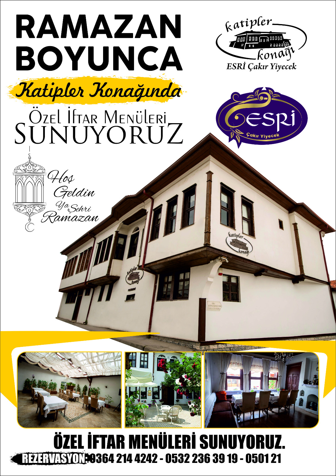 “Esri Çakır Yiyecek” tarafından işletilen Katipler Konağı’nda, günün çorbası, az mantı, et yemeği, pilav, Osmanlı şerbetinden oluşan iftar menüsüne ek olarak, zengin iftariye tabağı sunuluyor.