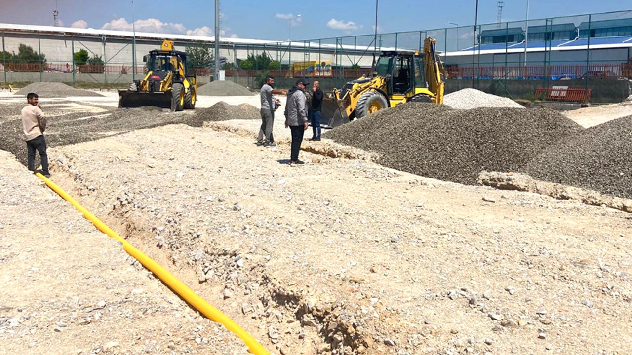 Zeminde bir metrelik hafriyat çalışmasının ardından yapılan 35 bin tonun üzerindeki çakıl seriminin ardından drenaj kılçık açımları yapıldı ve drenaj boruları yerleştirildi.
