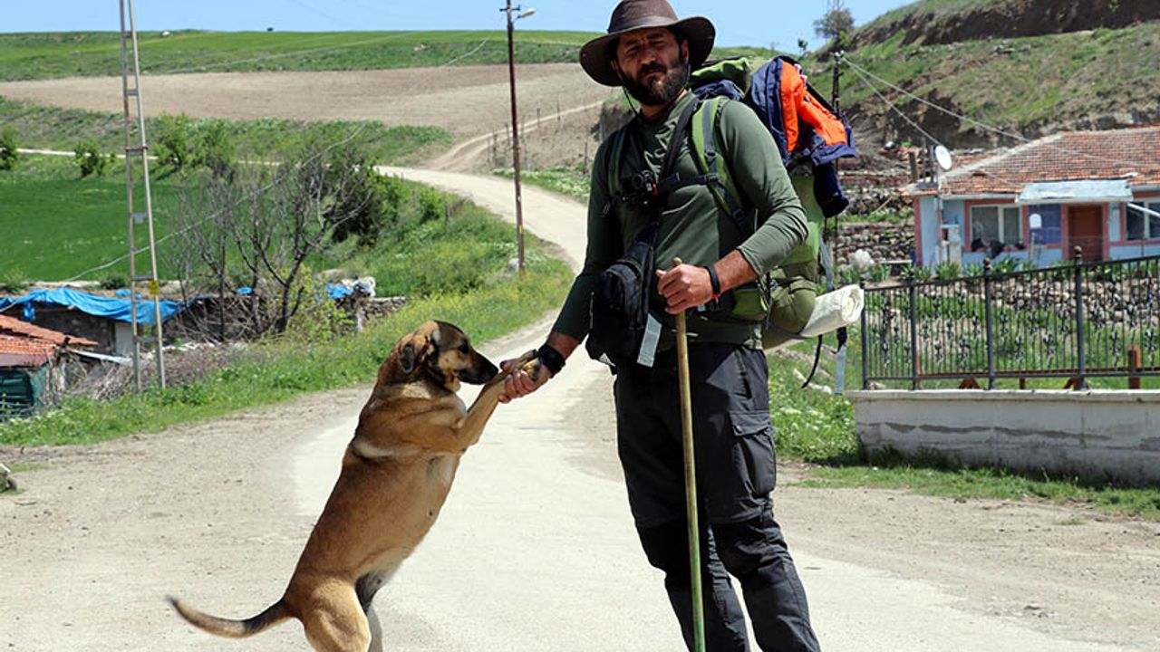 "81 il 81 fidan, ormanlar için yürüyorum" sloganıyla yola çıkan Özer, tostunun yarısını ikram ettikten sonra peşine takılan "Yoldaş" ismini verdiği köpekle birçok anı biriktirerek şu ana kadar 64 il gezdi.