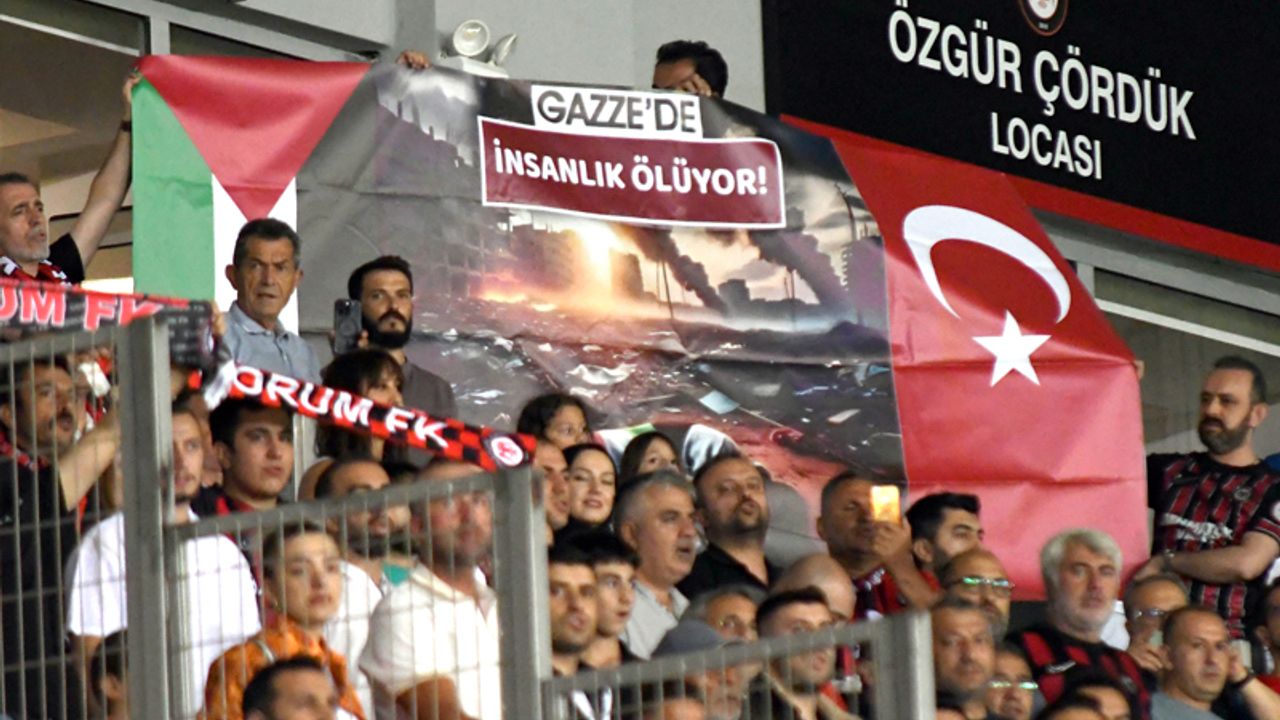 Protokol tribünü sol tarafında bulunan locadaki taraftarlar üzerinde Filistin ve Türk bayrağı bulunan ortasında ise Filisten’de yaşanan İsrail soykırımını gösteren görselin üzerine ise ‘Gazze’de insanlar ölüyor’ yazılı ise bu vahşete dikkat çekti