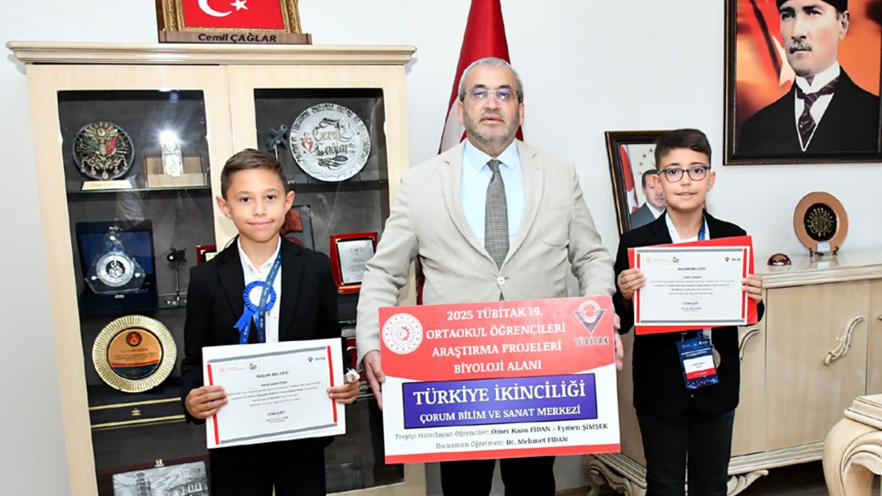 Çağlar, jüri tarafından 13.918 proje arasından seçilen ve ilk 180'e girerek Samsun Bölge 1.si olan projeyle Türkiye Finalleri’nde Çorum’u başarıyla temsil eden öğrencileri ve danışman öğretmeni kutladı. (Haber Merkezi)