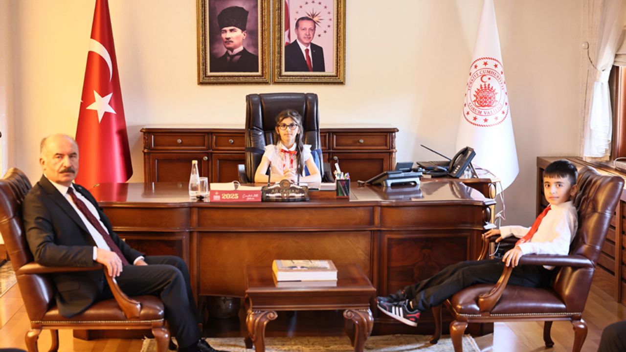 23 Nisan Ulusal Egemenlik ve Çocuk Bayramı'nın 105. yıl dönümü etkinlikleri kapsamında, Çorum Valisi Ali Çalgan makam koltuğunu temsili olarak Bekir Aksoy İlkokulu 3. sınıf öğrencisi İkra Pelin Yeler’e devretti.