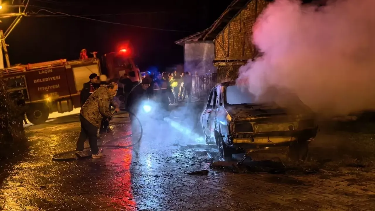 Laçin Belediyesi itfaiye ekiplerince söndürülen yangın nedeniyle otomobil kullanılamaz hale geldi.